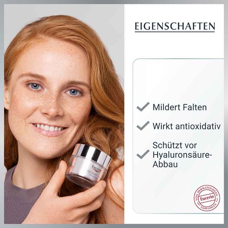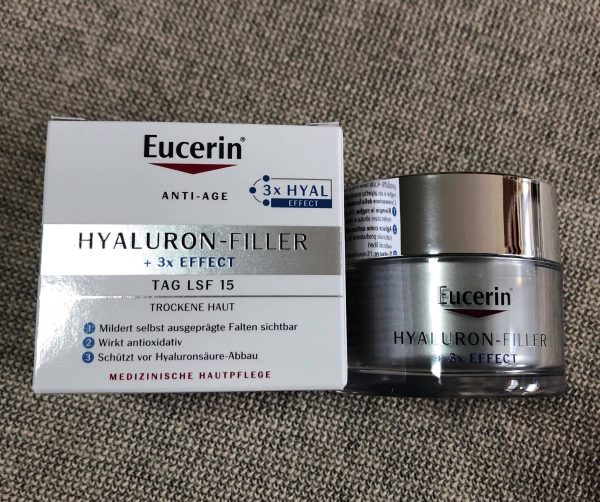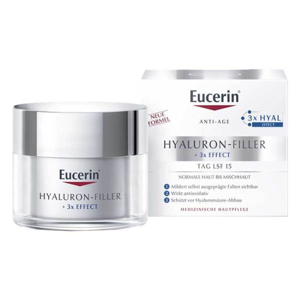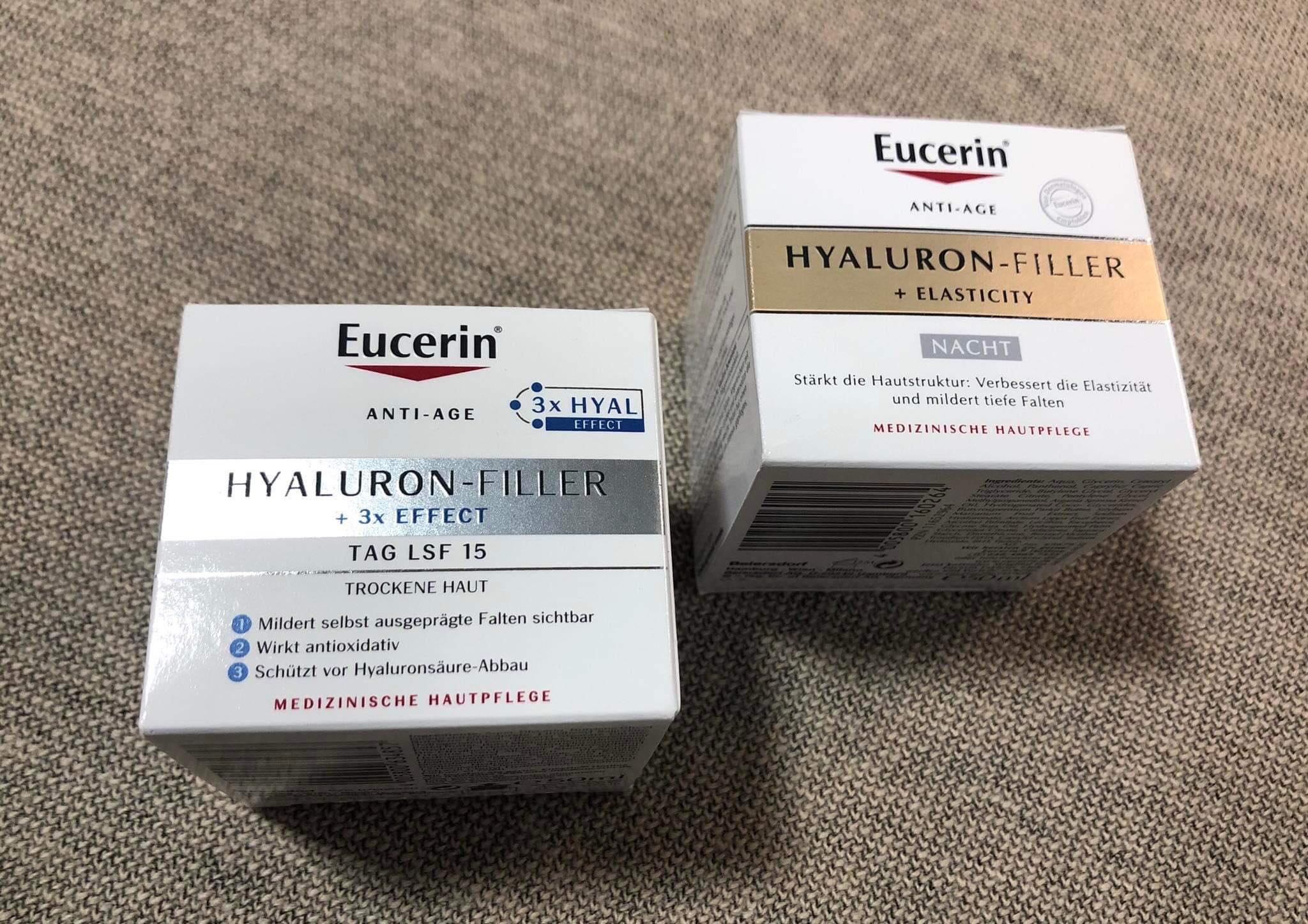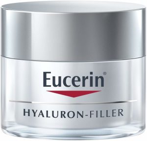 • Eucerin Hyaluron-Filler chăm sóc ban ngày cho da thường đến da hỗn hợp làm đầy những nếp nhăn sâu nhất từ ​​bên trong. Kem ban ngày kết hợp axit hyaluronic chuỗi dài với các phân tử axit hyaluronic chuỗi ngắn nhỏ hơn 40 lần, làm giảm nếp nhăn rõ rệt và giúp da mịn màng hơn rõ rệt.
