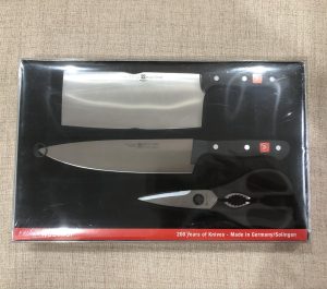 Bộ 3 món gồm 2 dao nhà bếp và kéo bao gồm dao đầu bếp Trung Quốc – 18 cm, dao đầu bếp – 20 cm và một đôi kéo nhà bếp bằng thép không gỉ.