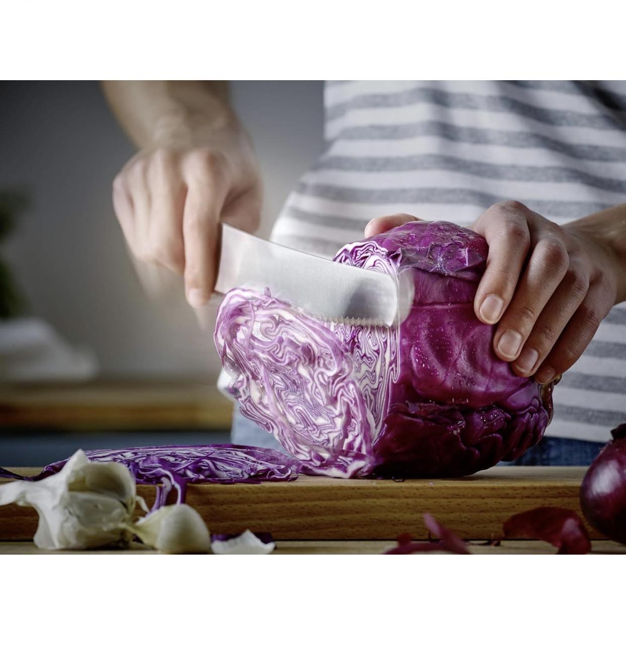 - Sắc bén và ổn định – lưỡi dao cắt bằng laser làm bằng thép không gỉ, có độ cứng 56° Rockwell và phần mở rộng dưới tay cầm, tương đương với độ ổn định và độ sắc bén của dao đầu bếp chuyên nghiệp được rèn