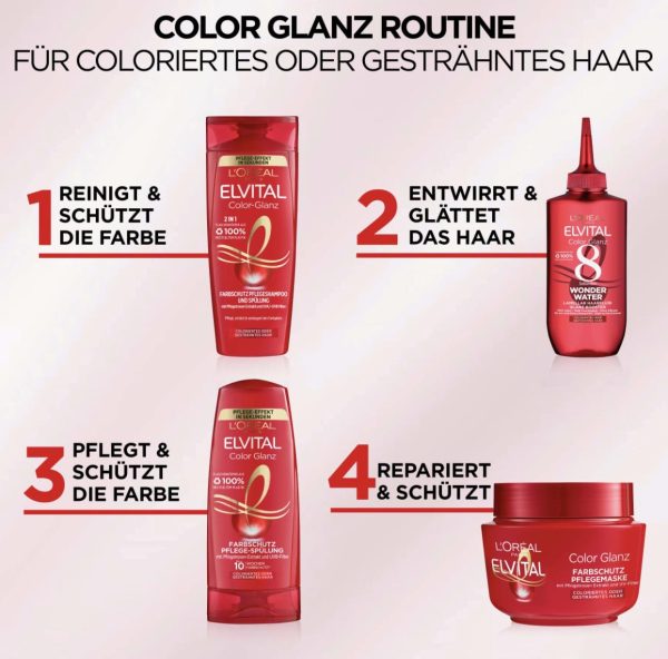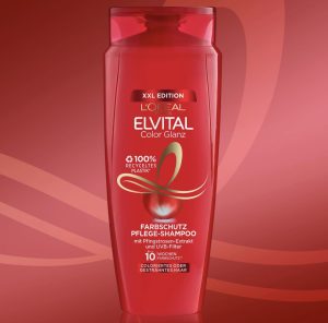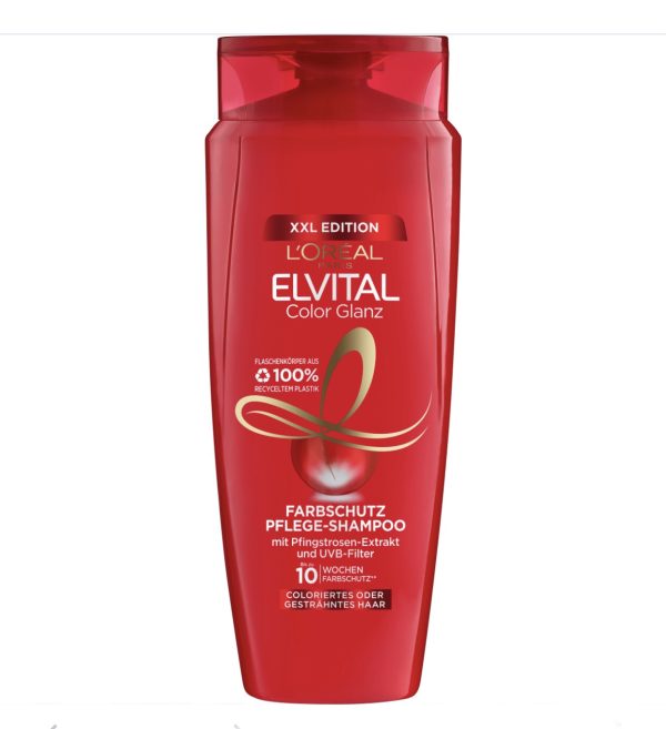 Dầu gội Elvital màu Glanz Đồng thời, bộ lọc UVA/UVB bảo vệ chống lại sự thay đổi màu sắc liên quan đến tia cực tím. Chất cô đặc Nutri đặc biệt nuôi dưỡng và làm mịn bề mặt tóc và đảm bảo độ sáng lâu hơn. Dầu gội đảm bảo màu tóc đậm, rạng rỡ và tươi sáng – lên đến 10 tuần