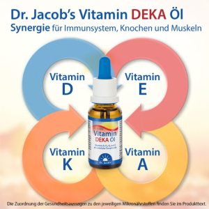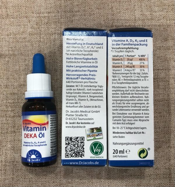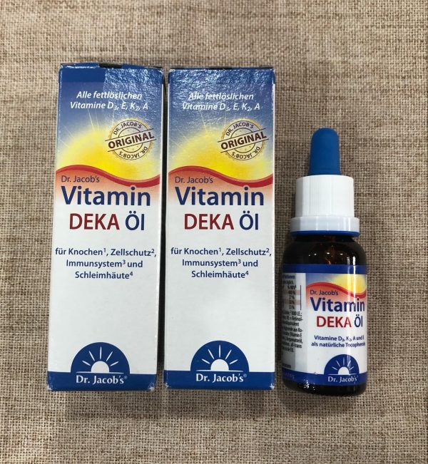 • Tiến sĩ Dầu Vitamin DEKA của Jacob kết hợp tất cả bốn loại vitamin tan trong chất béo chỉ trong một giọt và lý tưởng cho những ai muốn làm nhiều hơn nữa cho hệ thống miễn dịch của mình. Mỗi khẩu phần (1 giọt) có 20 µg (800 IU) vitamin D 3 , 12 mg tocopherols (4 mg vitamin E), 20 mg vitamin K 2 và 240 mg retinol tương đương (vitamin A).