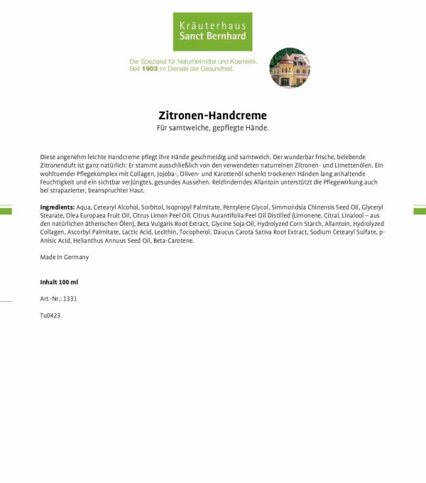 Mùi hương chanh tươi mát, tiếp thêm sinh lực tuyệt vời là hoàn toàn tự nhiên: nó chỉ đến từ chanh và dầu chanh tự nhiên được sử dụng. Một phức hợp chăm sóc nhẹ nhàng với collagen, jojoba, dầu ô liu và cà rốt mang lại cho bàn tay khô độ ẩm lâu dài và vẻ ngoài khỏe mạnh, trẻ hóa rõ rệt. Allantoin làm giảm kích ứng hỗ trợ hiệu quả chăm sóc ngay cả trên làn da khô và thật khô .