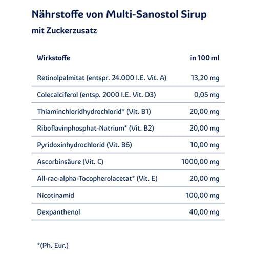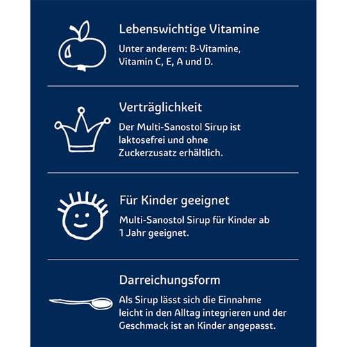 - Si-rô multi-sanostol cung cấp các vitamin quan trọng và cần thiết cho trẻ từ 1 tuổi. Bất cứ khi nào không được cung cấp đủ vitamin qua thực phẩm.Có thể xảy ra trong và sau khi bị bệnh nếu trẻ không thèm ăn.