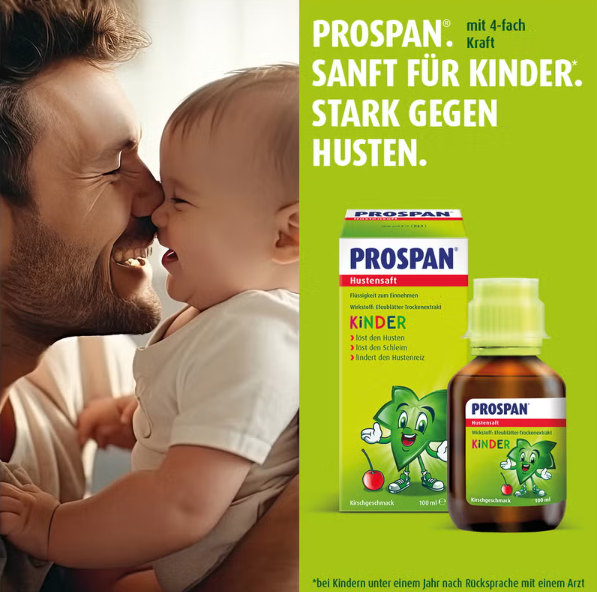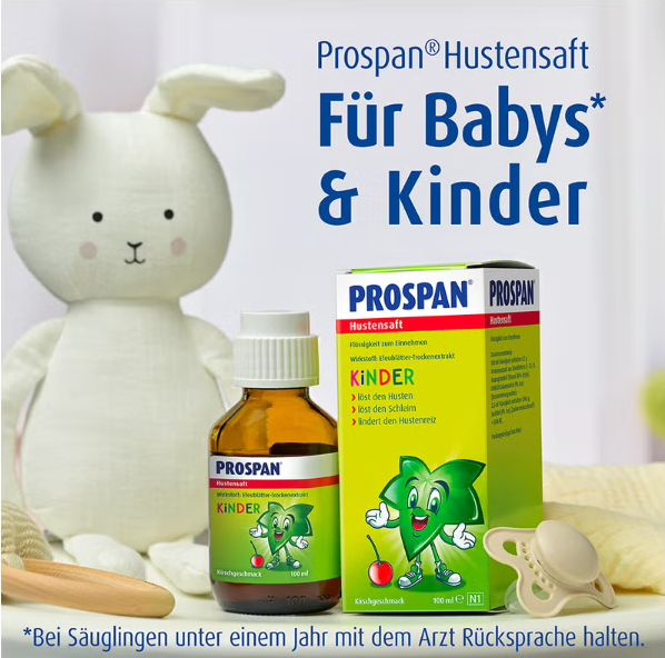 Prospan đặc biệt thích hợp cho bệnh ho và viêm phế quản ở trẻ sơ sinh và trẻ nhỏ. Tác dụng mạnh mẽ rõ rệt của xi-rô ho kết hợp với khả năng dung nạp đã được chứng minh của chiết xuất cây thường xuân đặc biệt EA 575 đã được kiểm tra và ghi nhận rộng rãi. Xi-rô ho Prospan không chỉ làm lỏng chất nhầy bị mắc kẹt trong phế quản mà còn mở rộng đường thở bị thu hẹp. Ngoài ra, Prospan còn làm giảm cơn ho và chống viêm. Xi-rô ho Prospan không chứa đường và có vị trái cây như quả anh đào.